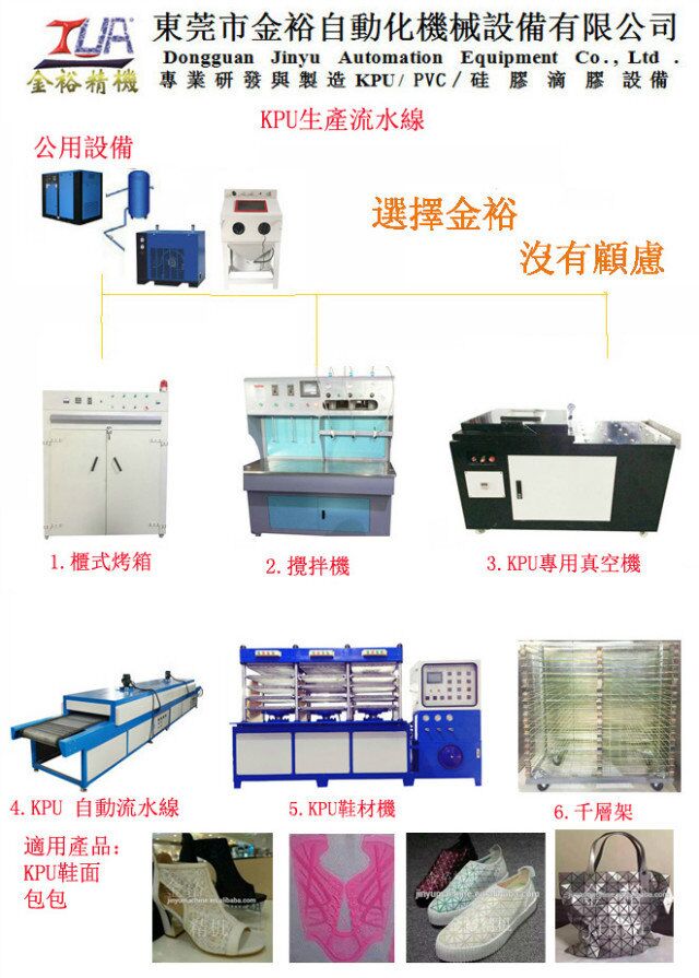 金裕精機主營產品:PVC滴塑機,多色液體注塑機,全自動點膠機,PVC鞋底流水線,合模機,PVC滴膠/滴塑流水線,硅膠設備,全自動硅膠生產線,KPU鞋面成型機,KPU鞋材機,服裝壓花機,自動生產線,硅膠硫化機等加工設備. 聯系人;王小姐電話:13825791798 微信:13825791798 QQ :731040131