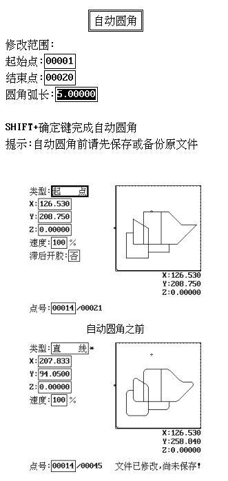 點膠機-高級編輯功能-自動圓角3)圖形平移 該功能主要用來統(tǒng)一調(diào)整圖形的XY坐標位置。先確定好圖形的起點,再將XY坐標移動到該起點需要移動的XY坐標位置,調(diào)用該功能后,整個圖形自動平移到當前位置。該功能也可在文件編輯界面中按下Shift+小數(shù)點鍵調(diào)用。 4)圖形縮放 該功能主要用于統(tǒng)一放大和縮小XY的坐標值。與批量修改方式不同的是,該功能也會一起放大和縮小圓弧、橢圓的半徑。 5)Z軸深度 該功能主要用來統(tǒng)一調(diào)整圖形的Z軸坐標和針高。先確定好圖形的起點,再將Z軸移動到該起點需要調(diào)整的Z坐標位置,調(diào)用該功能后,整個圖形的Z軸坐標和針高都會根據(jù)當前Z坐標的值進行調(diào)整。該功能也可在文件編輯界面中按下Shift+負號鍵調(diào)用。(使用該功能時注意偏移后的針高不要超限,否則不能正常運行并產(chǎn)生超限錯誤) 6)抬針高度 該功能以相對于Z軸坐標的方式批量修改針高的值。 例如某點的加工點類型為“單點”,Z坐標為-70,如果將抬針高度設為30后,該點的針高被修改為:(-70+30)= -40。 7)批量刪除 先選定需要刪除的加工點范圍,按Shift+確定鍵刪除。如果要全部刪除也可以在文件編輯界面中按Shift+刪除鍵。 8)自動圓角 該功能用于將折角轉(zhuǎn)換為圓弧,圓弧的弧長可設置,若兩折角邊長不夠完成轉(zhuǎn)換成設定的弧長,則圓角弧長會自動減小來適應兩折角邊長。 ![]() 東莞市金裕自動化機械設備有限公司成立于2000年,金裕坐落于東莞市大嶺山向東工業(yè)區(qū),創(chuàng)辦硅膠、PVC商標禮品生產(chǎn)設備.金裕研發(fā)的全自動全自動點膠機、矽膠機、油壓機、KPU鞋材機以及終于實現(xiàn)了的智能無人車間生產(chǎn)流水線,金裕的自動化設備可以做到讓你省人、省電、省管理。金裕公司歡迎新老顧客來訪,選擇金裕,沒有顧慮。www.shanghaizhaojing.com |