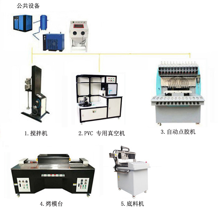 PVC類公仔、商標禮品、鑰匙扣、冰箱貼、五金徽章、電子產(chǎn)品點膠及各類PVC產(chǎn)品生產(chǎn)流程: 1.原料分散攪拌配色 2.原料抽氣泡 3.點膠機編程上模點膠 4.過烤箱定色定型 5.填底料 pvc生產(chǎn)流水線配套設(shè)備: 1.攪拌機 2.配色機 3.真空機 4.全自動點膠機 5.烤箱流水線 6.自動底料機