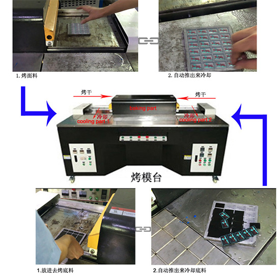 金裕精機(jī)-pvc自動(dòng)烤模臺(tái),主要用于pvc產(chǎn)品顏色定型烤色和底料烤熟工藝。如:pvc公仔禮品、商標(biāo)、手表帶、U盤(pán)套、鑰匙扣、行李牌、膠章、杯墊等。機(jī)器自動(dòng)進(jìn)出模具,上下加溫獨(dú)立控制,配有2工位加溫區(qū),帶自動(dòng)冷卻。