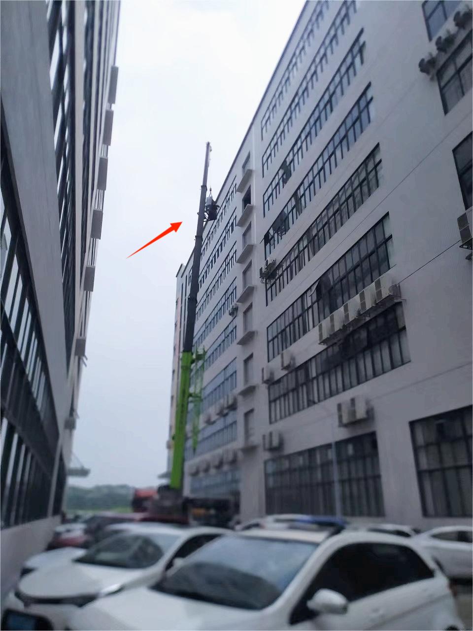 先是吊車將這臺硫化機設備從樓層上運輸下來,再轉(zhuǎn)移到運輸車上進行打包等操作。