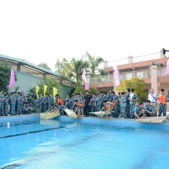 第三個(gè)項(xiàng)目是人造紙船,造好的船由一個(gè)重量120斤的學(xué)員坐上船劃過(guò)游泳池。大家集思廣益,你一言,我一語(yǔ),充分發(fā)輝每個(gè)人的想象力和創(chuàng)造力。造出來(lái)的船款式多樣,各有特色。比賽開(kāi)始后,有的一路順暢,安全劃到終點(diǎn),有的在水中劃行一段后,紙進(jìn)水被打濕,隊(duì)員被泡在水里。人在船在,在大家的加油聲中,學(xué)員拖著紙船,努力游向終點(diǎn)。相信經(jīng)過(guò)這次失敗,如果再造船的話(huà)都會(huì)成功。這個(gè)游戲告訴我們,要發(fā)揚(yáng)團(tuán)隊(duì)開(kāi)拓精神,勇于創(chuàng)新,敢于嘗試。就算是失敗,我們也可以從中收獲很多經(jīng)驗(yàn)和不足,為以后的成功奠定基礎(chǔ)。