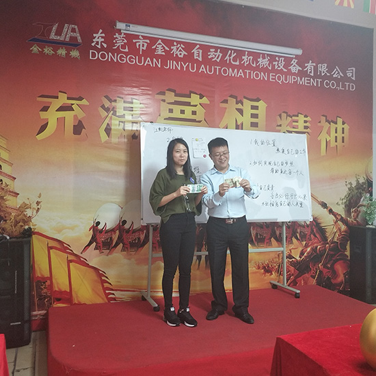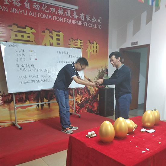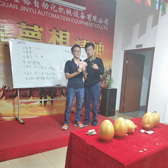 一月一次的金裕砸蛋,又來了。給大家介紹下金裕砸蛋的規(guī)則,每個月第一個下單的,還有這個月銷量最高的,但然這次砸蛋的是我們最先開單的是外貿(mào)主管Bear,和我們銷售冠軍楊總。這次金蛋里金額未知,大獎花落誰家,請看下面![]() 五個金蛋,一把錘,到底誰能砸中那個最高額的金蛋呢 ![]() 首先上陣的是Bear,能看出她的表情有些猶豫不定的 ![]() 她好像已有了答案,面帶微笑,拿著錘子指向那顆金蛋 ![]() Bear奮力一錘,雖然面部表情略帶猙獰,但這都不重要,到底砸了多少呢?稍后揭曉... ![]() 接下來上場的就是我們的老楊同志了,沒有猶豫,敲開了錘子下面的那顆金蛋.. ![]() 沒有錯,現(xiàn)在來揭曉金蛋數(shù)額,我們的Bear和楊總的分別金額是50和108RMB,恭喜恭喜,雖沒有砸到金額最大的金蛋,那就讓我們期待下下個月的金裕砸金蛋,看大獎花落誰的口袋。 ![]() ![]() 接下來呢這個是我們工程部小陳,小陳很好的完成了領(lǐng)導(dǎo)任務(wù),因此獎勵RMB1000, ![]() ![]() 東莞市金裕自動化機械設(shè)備有限公司成立于2000年,坐落于東莞市大嶺山向東工業(yè)區(qū),金裕研發(fā)的全自動點膠機、矽膠機、油壓機 KPU鞋材機等,金裕的自動化設(shè)備可以做到讓你省人、省電、省管理。金裕公司歡迎新老客戶來訪,讓我們共同成長。