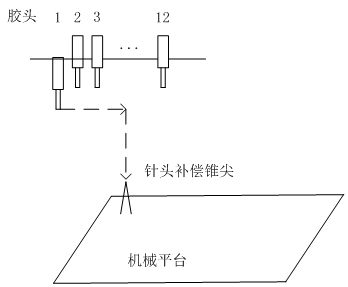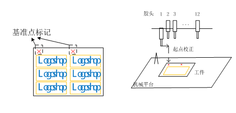 滴塑機(jī)針頭補(bǔ)償 當(dāng)各種異常原因?qū)е箩橆^歪了,或者更換了針頭時(shí)。為了補(bǔ)償針頭更換后發(fā)生的位置偏差,需要進(jìn)行針頭補(bǔ)償操作。 如圖所示。針頭補(bǔ)償?shù)倪^(guò)程就是通過(guò)示教盒或Logoshop的針頭補(bǔ)償功能,依次把各個(gè)針頭通過(guò)點(diǎn)動(dòng)移動(dòng)至對(duì)準(zhǔn)滴塑機(jī)平臺(tái)上的固定錐尖。XYZ方向都務(wù)必對(duì)準(zhǔn),否則可能會(huì)對(duì)后面的調(diào)試帶來(lái)較大的麻煩。 基準(zhǔn)點(diǎn)和起點(diǎn)校正 如圖所示,在軟件設(shè)計(jì)滴塑機(jī)路徑的時(shí)候,需要在關(guān)鍵位置設(shè)置一個(gè)基準(zhǔn)點(diǎn)。調(diào)試時(shí),使用起點(diǎn)校正功能,把針頭對(duì)準(zhǔn)模具上的與基準(zhǔn)點(diǎn)對(duì)應(yīng)的實(shí)際基準(zhǔn)位置。才能進(jìn)一步的調(diào)試和加工。設(shè)置基準(zhǔn)點(diǎn)和進(jìn)行起點(diǎn)校正,就是把程序坐標(biāo)系和實(shí)際的模具的機(jī)械坐標(biāo)系聯(lián)系起來(lái)。