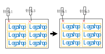 第三步:在顏色列表中,選擇顏色1,按下[2]偏移。這樣膠頭1和膠頭3會同時打下來,對到基準點的位置上。膠頭1的位置是準的。需要調整螺絲和掰針頭,使得膠頭3對準右列的基準點。如下示意圖所示。注意:針頭3的位置是通過機械保證的,和文件無關。在調針頭3的位置時,不要修改文件,否則會導致針頭1也不準了,從而前功盡棄。