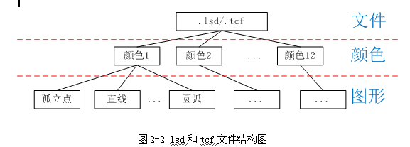 lsd和tcf這2種文件的結(jié)構(gòu)如圖2-2所示。文件分為1~12種顏色。每種顏色都是由最基本的圖形組成。這些圖形可以是孤立點、直線、圓弧、整圓、多段線、樣條曲線等。